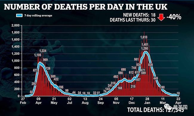 最新数据显示,截止到4月14日的一周里,英国新冠感染率比上周下降9%,死亡人数下降26%,住院人数下降19%。