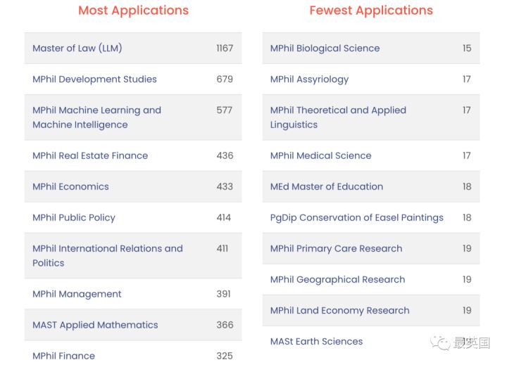 在剑桥大学授课型研究生申请项目的激烈程度方面,竞争最激烈的前五名分别是: