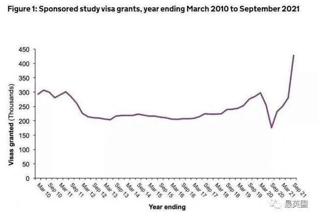 在截止到2021年9月的一年中,英国内政部共发放了超过42.8万份担保学生签证(sponsored study visas),其中包括包括主要签证申请人和他们的家属。