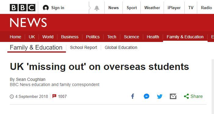 据BBC在2018年9月4号(昨天)的报道,英国正在流失海外留学生!